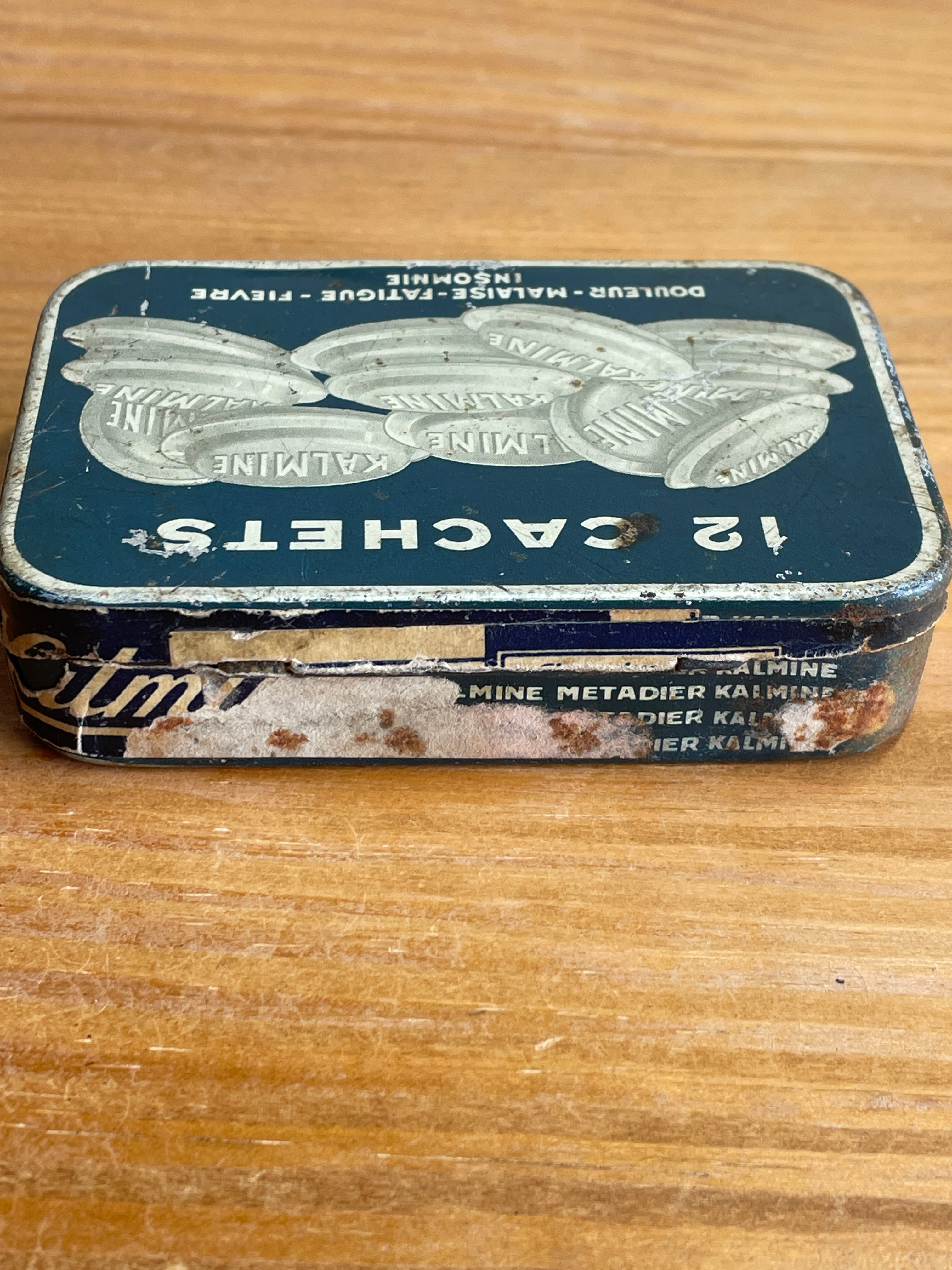 フランスのP.Métadier が製造したKALMIN (鎮痛剤のようなもの)の 12 CACHETS (12錠)のティン缶です。紺と黄色がかったベージュのイラストが可愛らしいデザインです。